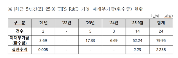 이재관 의원실이중소벤처기업부로부터 제출받은 '최근 5년간(21~25.9) 팁스 R&D기업 환수금 현황' 자료에 따르면 총 24건으로 환수대상액은 79.95억 원에 달했다.