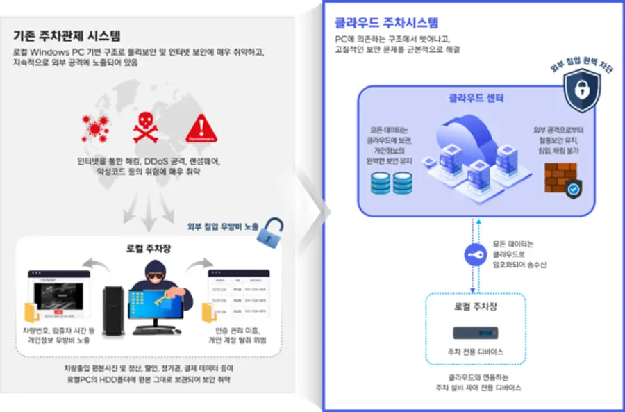 ‘365클라우드’는 입출차 및 정산에 필요한 모든 데이터의 저장과 처리가 클라우드 기반으로 이뤄진다. 이에 따라 기존 로컬 PC 기반 시스템의 고질적 한계였던 ▲날씨 등 외부환경에 따른 노후화 및 유지보수 비용 증가 ▲관리 PC 장애로 인한 데이터 손실 및 결제 오류 ▲개인정보 유출을 비롯한 보안 취약성 등의 여러 문제를 동시에 해결할 수 있는 차세대 주차관리 시스템으로 각광받고 있다.