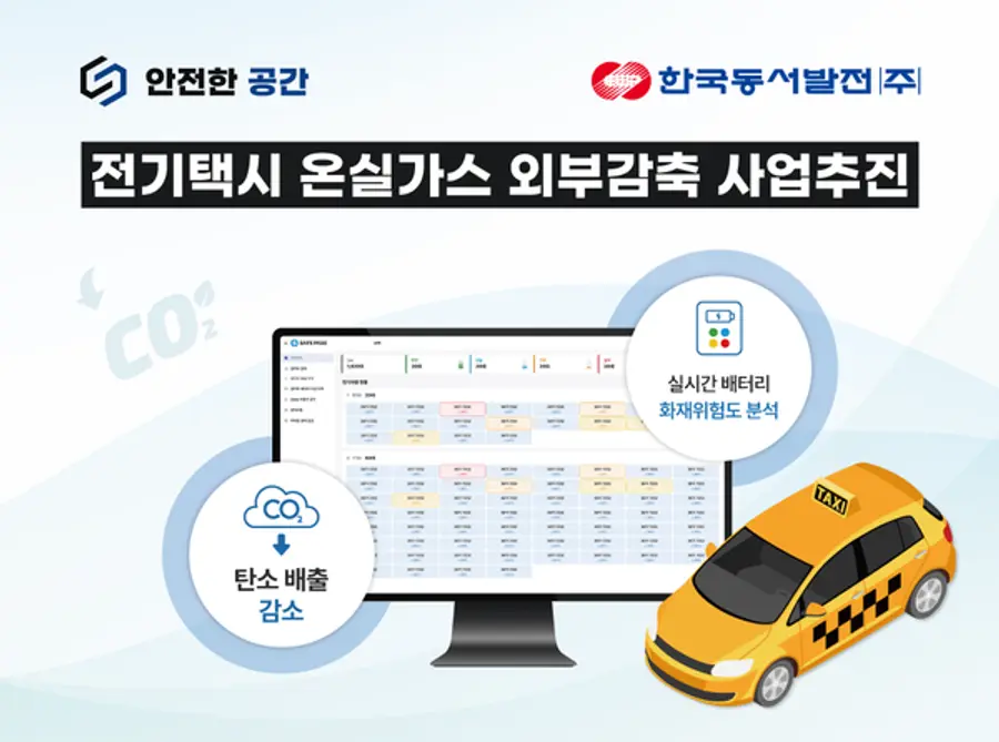 |스마트투데이=한민형 기자| 전기차 화재 사전예방 모니터링 서비스를 제공하는 ㈜안전한공간(대표 신영철)과 한국동서발전㈜(사장 권명호)이 부산택시운송사업조합 소속 전기택시 1500대를 대상으로 온실가스 외부감축 시범사업을 공동으로 추진한다고 26일 밝혔다.