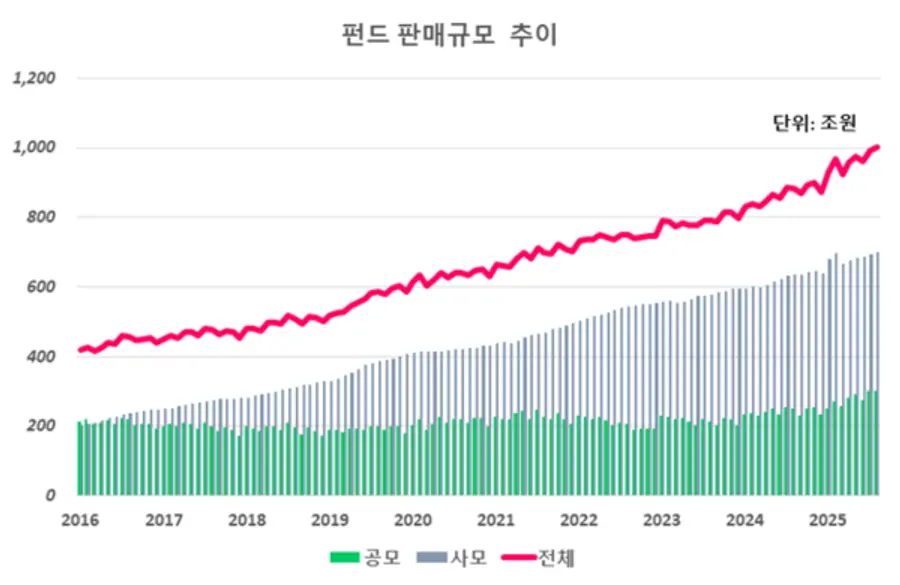 전체 펀드 판매잔고는 2024년 말 872조8000억 원 대비 130조2000억 원이 늘며 올 들어 14.9% 증가했다.