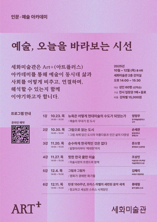 |스마트투데이=이재수 기자| 세화미술관(관장 서혜옥)은 10월 23일부터 12월 11일까지 인문학 아카데미인 ‘ART+(아트플러스)’를 운영한다고 1일 밝혔다.