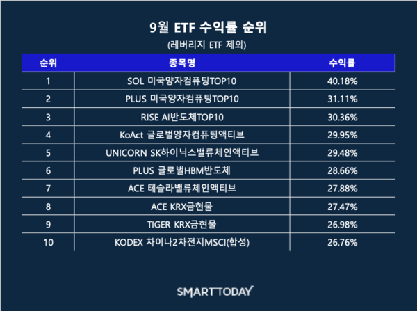 |스마트투데이=심두보 기자| 9월 ETF 시장에서 단연 두드러진 테마는 양자 컴퓨팅이었다. 월간 ETF 수익률 상위 1위와 2위, 4위가 모두 양자컴퓨팅 ETF에 해당한다. 반도체 ETF와 금 ETF 역시 9월 매우 우수한 퍼포먼스를 보였다.