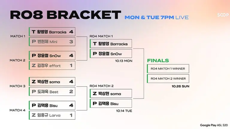 특히 이번 ASL 4강에 진출한 선수들 모두 이번 시즌 첫 우승을 도전하며 16강을 1위로 진출한 실력자들인 만큼 어느 때보다도 박진감 넘치는 멋진 경기력을 보여줄 것으로 예상된다. 4강전은 7전 4선승제로, 양 선수가 맵을 하나씩 선택해 진행된다.