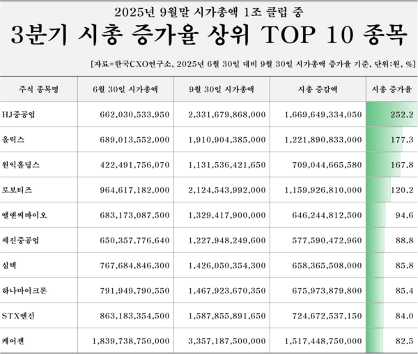 전체 시장 규모는 크게 팽창했지만, 개별 종목의 성적표는 '매우 불균등'했다. 전체 조사 대상 종목 중 53.5%(1,478곳)는 6월말 대비 9월말 시총이 하락한 것으로 확인됐다. 반면 상승한 종목은 41.8%(1,156곳)에 그쳐, 올 3분기 주식시장에서 10곳 중 4곳 정도만 시총 상승의 온기를 누린 셈이다.