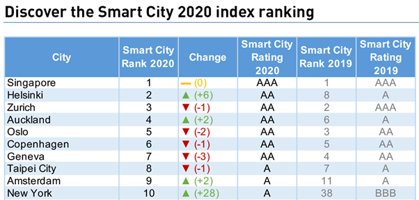 경제·기술 데이터는 물론 기술이 삶의 질에 미치는 영향에 대한 시민들의 인식까지 포함하여 조사한 2020 글로벌 스마트시티 지수 순위에서 싱가포르는 지난해에 이어 1위를 차지했고, 핀란드 수도 헬싱키와 스위스 취리히가 그 뒤를 이었다. 뉴질랜드의 오클랜드가 4위, 노르웨이의 수도 오슬로가 5위를 차지하고 있다. 코펜하겐(6위), 제네바(7위), 타이베이(8위), 암스테르담(9위), 뉴욕(10위)이 스마트시티 랭킹 TOP 10에 올랐다.