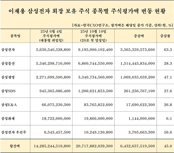 10일 기업분석전문 한국CXO연구소가 이재용 회장의 주식평가액 변동 현황을 조사한 결과, 이 회장의 주식가치는 이날 종가 기준 20조 7,178억 원으로 평가됐다. 이는 이재명 정부 출범(6월4일) 이후 불과 129일 만에 45% 이상 급증했다.