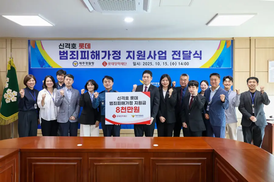 |스마트투데이=김윤진 기자| 롯데장학재단이 전일 제주경찰청에서 <신격호 롯데 범죄피해 가정 지원사업 전달식>을 열고, 제주 지역 범죄피해가정 내 청소년 20명에 총 8000만 원을 지원했다고 16일 밝혔다.