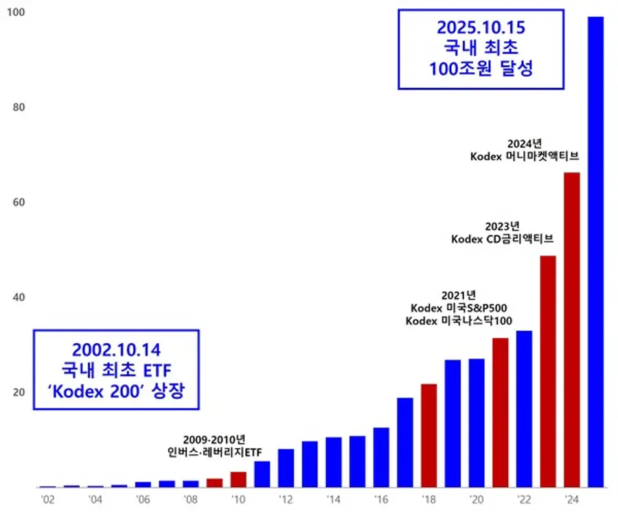 삼성자산운용은 KODEX ETF 순자산 합계가 총 100조5071억원을 기록했다고 16일 밝혔다. 2002년 10월14일 대한민국 최초 ETF인 KODEX 200을 내놓은 이후 23년 만에 이룬 금자탑이다.
