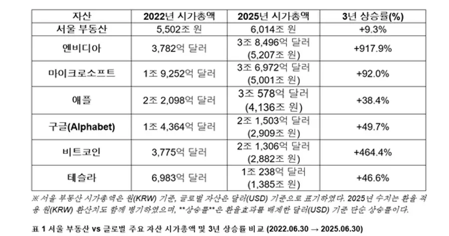 글로벌 빅테크 및 가상자산은 이 기간 엔비디아 917.9%, 마이크로소프트 92.0%, 애플 38.4%, 알파벳(구글) 49.7%, 비트코인 464.4%, 테슬라 46.6% 등 각각 높은 성장세를 기록한 만큼 글로벌 빅테크 기업들이 조만간 서울지역 부동산 시총을 넘어설 전망이다.