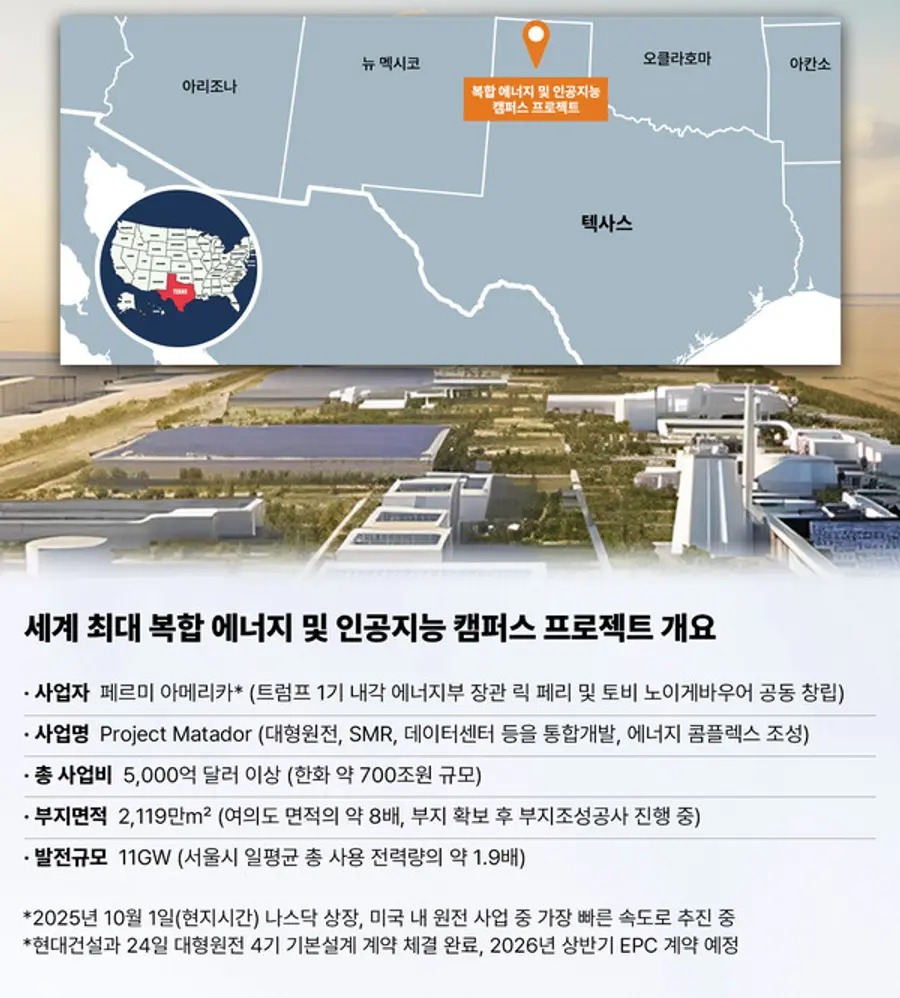 ‘복합 에너지 및 인공지능(AI) 캠퍼스’는 미국의 에너지 디벨로퍼인 페르미 아메리카가 텍사스주 아마릴로 외곽의 약 2119만㎡ 부지에 조성하는 세계 최대 규모의 민간 전력망(HyperGrid™) 단지다. △AP1000 대형원전 4기(4GW) △SMR(2GW) △가스복합화력(4GW) △태양광 및 배터리에너지저장시스템(1GW)을 결합한 총 11GW 규모의 독립형 전력 공급 인프라와 이 전력을 연계할 초대형 하이퍼스케일 AI 데이터센터의 단계적 구현을 계획하고 있다.