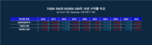 2016년부터 2025년까지 최근 10년간의 연간 성과를 비교한 결과, TIGER 200은 8개 연도에서 KODEX 200의 수익률을 앞질렀다. KODEX 200이 TIGER 200보다 높은 성과를 낸 것은 2024년이 유일했으며, 2017년에는 두 상품의 성과가 동일했다.