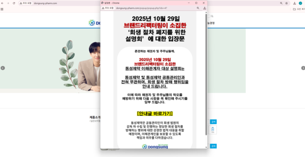 동성제약은 개인주주 브랜드리팩터링이 정당한 회생절차를 폐지하고 방해하려는 목적으로 여는 행사로 판단, 강경한 법적 조치를 통해 대응할 것이라고 밝혔다.