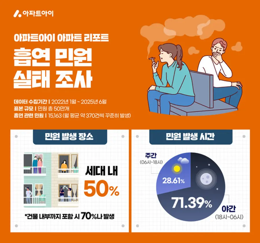 아파트아이가 022년 1월부터 2025년 6월까지 관리사무소에 등록한 민원 50만여 건을 조사한 결과 약 2만 건이 흡연과 관련된 것으로 나타났다. 실제 흡연 민원은 월평균 4백 건 이상 꾸준히 발생하고 있다.