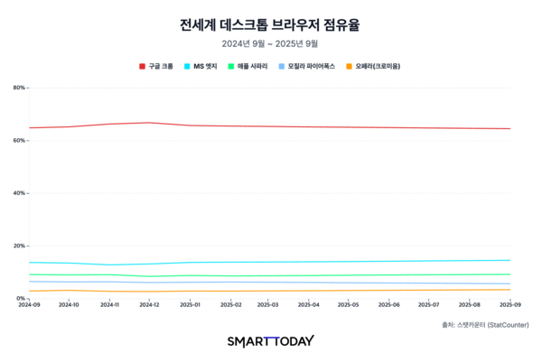 데스크톱 브라우저 시장은 이미 판도가 굳어져 후발주자가 두각을 보이기 어려운 구조다. 웹 트래픽 분석 사이트 스탯카운터에 따르면, 전 세계 데스크톱 브라우저 시장은 크롬이 약 70%의 점유율을 차지하며 사실상 독점하고 있다. 엣지는 15% 미만, 사파리는 10% 수준에 머문다. 컨텐츠 소비 활동이 주가 되는 모바일과 태블릿 환경에서는 애플 사파리와 삼성 인터넷 등 제조사 브라우저가 20~30%대 점유율을 확보하고 있지만, 생산 활동이 중심이 되는 데스크톱 환경에서는 대부분의 국가에서 크롬의 점유율은 최소 60% 이상으로 강력한 존재감을 뽐내고 있다.