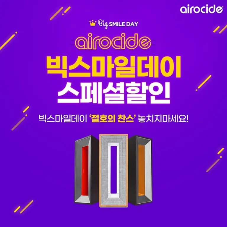 |스마트투데이=이은형 기자 | NASA 기술을 담은 프리미엄 공기살균기 ‘에어로사이드(Airocide)’는 1일부터 11일까지 진행되는 G마켓 ‘빅스마일데이’ 행사에 참여해 특별 할인 혜택을 제공한다고 1일 밝혔다.