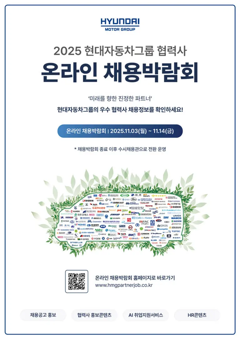 |스마트투데이=김세형 기자| 현대자동차그룹이 협력사와 함께 자동차 산업의 새로운 채용 트렌드 구축과 고용시장 활성화를 위해 '2025 현대자동차그룹 협력사 온라인 채용박람회'를 개최한다고 2일 밝혔다.