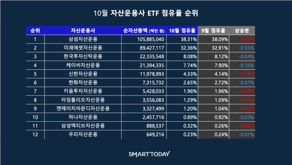 |스마트투데이=심두보 기자| 삼성자산운용이 ETF 순자산 점유율 1위를 유지하는 가운데 2위 미래에셋자산운용과의 격차는 더 벌어졌다.