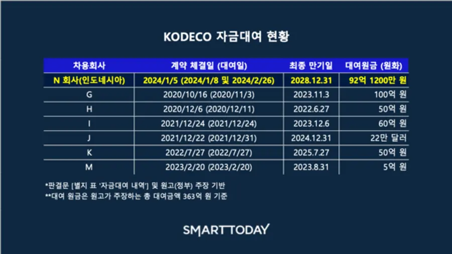 정부가 문제 삼은 총 대여 원금은 363억 원대에 달하며, 이 중 소송 제기 시점까지 미회수된 원금만 345억 원에 이르는 것으로 나타났다. 법원은 정부가 제기한 여러 사유 중, 사주일가와 관계된 인도네시아 N사를 상대로 한 92억 원대 컨설팅 계약과 92억 원대 추가 대출 건을 B 이사 해임의 결정적 사유로 인정했다.