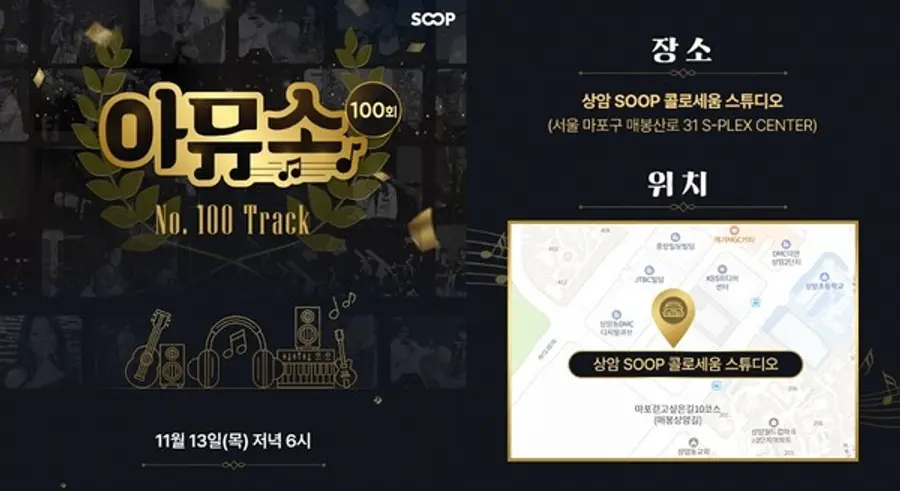 ‘아뮤소’ 100회 기념 공연은 오는 13일 오후 6시, 서울 상암동 SOOP 콜로세움 스튜디오에서 열린다. MC 가습기와 안예슬을 비롯해 역대 MC와 특별 게스트, 약 30명의 스트리머와 뮤지션이 함께 무대를 꾸민다. 발라드, 락, 뮤지컬, 밴드, 국악, 댄스, 힙합, 버추얼 등 다양한 장르가 어우러진 공연이 온·오프라인으로 동시에 진행될 예정이다.