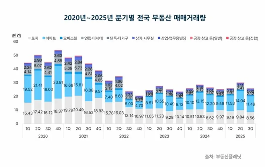 상업용 부동산 전문 프롭테크 기업 부동산플래닛이 13일 발표한 '2025년 3분기 전국 부동산 유형별 매매시장 동향 보고서'에 다르면 3분기 전국 부동산 거래량은 25만7871건, 거래금액은 104조2115억원으로 전분기 대비 각각 14.1%, 17.3% 감소했다. 전체 26만4652건, 109조3040억원을 기록한 전년 동기와 비교하면 거래량은 2.6%, 거래금액은 4.7% 하락한 수준이다.