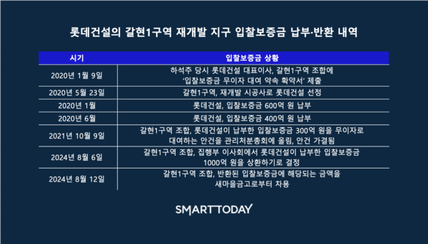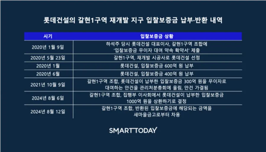롯데건설 관계자는 “2020년 5월 시공자 선정 총회가 열린 갈현1구역에서 입찰보증금을 전액 무이자로 대여하는 건 관련 규정에도 어긋나는 일”이라며 “사업제안 시 1000억 원을 100% 유이자 사업비로 제안했고, 이를 근거로 2020년 7월 공사도급계약을 체결했다. 2021년 9월에는 조합원 총회의결로 1000억 원 중 300억 원에 대해선 무이자 대여로 집행 방향이 결정됐다”고 설명했다.