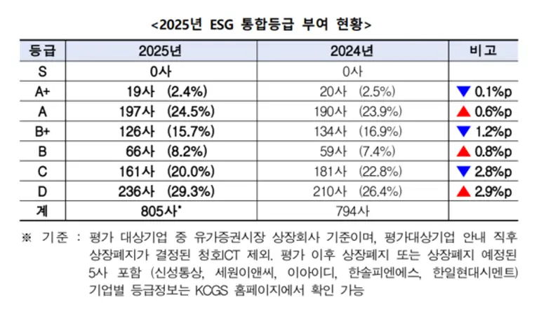 |스마트투데이=김세형 기자| 한국ESG기준원(이하 KCGS)은 19일 2025년 국내 기업의 ESG(환경·사회·지배구조) 수준을 평가한 ESG 등급 결과를 공표했다.