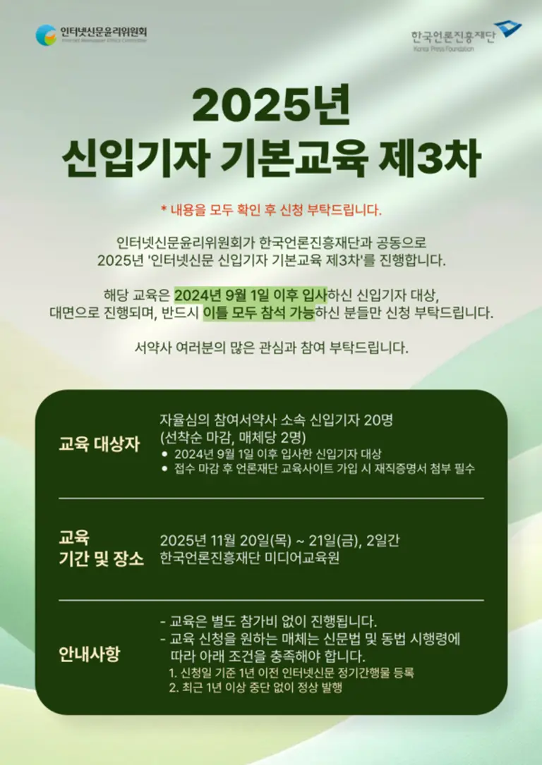 |스마트투데이=이슈팀 기자| 인터넷신문윤리위원회(위원장 이재진, 이하 '인신윤위')는 20일부터 21일)까지 이틀간 한국언론진흥재단 미디어교육원에서 「2025 인터넷신문 신입기자 기본교육」을 진행한다고 밝혔다.