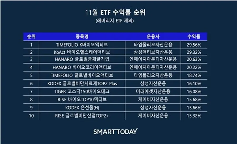 이번 순위에서 눈에 띄는 자산운용사는 NH아문디자산운용이다. 이 자산운용사의 ETF인 HANARO 글로벌금채굴기업과 HANARO 바이오코리아액티브는 각각 20.63%와 20.22%라는 우수한 수익률을 기록했다. 11윌 수익률 3위와 4위에 해당하는 수치다.