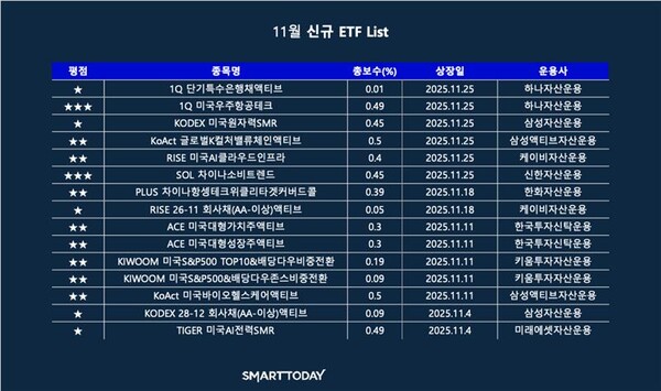 |스마트투데이=이태윤 기자| 2025년 11월 새롭게 출시된 ETF는 15개다. 11월은 중소형 운용사의 창의적인 ETF가 주목받은 달이었다.