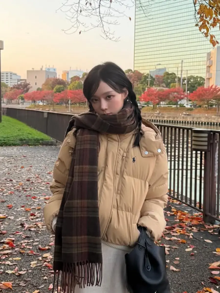 노을이 비친 도심의 가을 풍경을 배경으로 패딩과 체크 머플러를 매치한 윈터는 포근하면서도 감각적인 스타일을 선보였다.