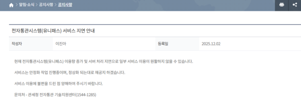 |스마트투데이=황태규 기자| 쿠팡 고객 개인정보 유출 사고가 발생하면서 관세청의 '유니패스(전자통관시스템)' 홈페이지가 원활하게 운영되지 않고 있다.