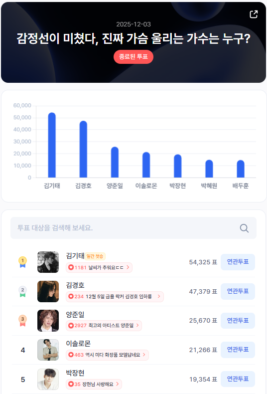 |스마트투데이=박지환 기자| 김기태가 ‘감정선이 미쳤다, 진짜 가슴 울리는 가수는 누구?’ 투표에서 1위를 차지했다.