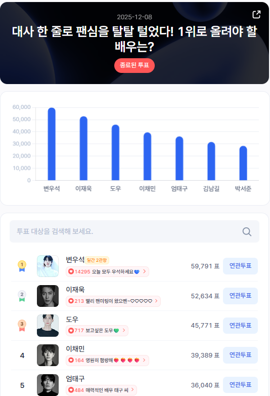 2위는 5만2634표를 얻은 이재욱이 차지했다. 팬미팅을 기다리는 팬들의 활발한 반응이 눈에 띄며, 그의 활동 복귀 분위기와 맞물려 응원 열기가 이어지고 있다. 작품을 통해 쌓아온 안정적인 존재감이 팬심 결집을 견인한 것으로 보인다.