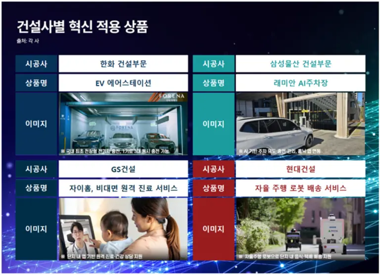 이외에도 GS건설 자이홈의 ‘비대면 원격 진료 서비스’ 삼성물산 ‘래미안 원페를라’의 ‘래미안 AI 주차장’, 현대건설 ‘디에이치 대치 에델루이’의 ‘자율주행 로봇 배송 서비스’ 등이 있다.
