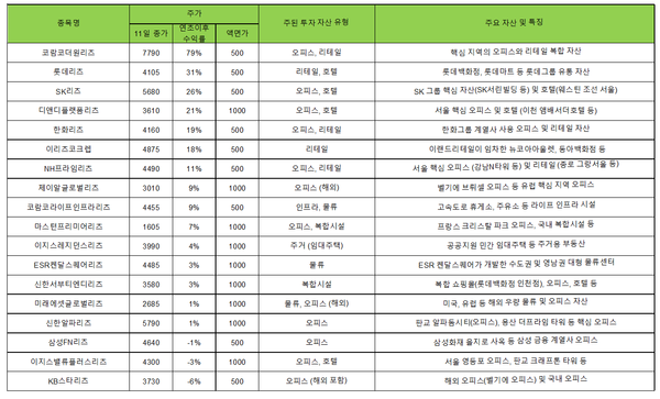 |스마트투데이=김종현 기자| 대기업계열 리츠들이 연초 이후 수익률에서 상위권을 휩쓸었다. 여타 독립 리츠종목과 달리 상대적으로 안정적이고 꾸준한 계열사 임대를 주된 수익원으로 두고 있는 영향으로 풀이된다. 특히 이들 대기업리츠의 주된 투자 자산이 이른바 도심내 핵심상권(시내-CBD,강남-GBD, 여의도-YBD)에 위치한 오피스 건물이라는 측면에서 여타 리츠와 달리 상대적으로 안정적이고 높은 임대수익을 주된 수익원으로 두고 있다는 점이 리츠 종목별 수익률 격차로 이어진 것으로 풀이된다.
