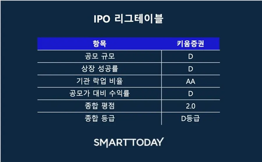 9곳 주관사를 4개 기준으로 상대 비교해 기준별 순위에 9개 등급(D~AA)을 설정했습니다. 종합 등급은 기준별 점수를 평균해 다시 순위별로 적용했습니다. 공모 규모는 한국거래소 카인드(KIND)에서 제공하는 통계 기준입니다. 상장 성공률은 상장 종목과 스팩 합병 포함 상장예비심사 미승인·철회 및 공모 철회 종목을 합산해 비중을 구했습니다. 기관 락업 비율은 IPO 제도 개편을 적용 받는 7월1일 증권신고서 제출 기업을 대상으로 산출했습니다. 공모가 대비 수익률은 3개월 시장 초과 수익률을 산출할 수 있는 종목을 평균했습니다. 공모주 특성상 단기 수급 변동성이 주는 영향을 최소화하고자 수익률 상위 증권사 대비 10%p 이내 격차 증권사에는 같은 등급을 부여했습니다.