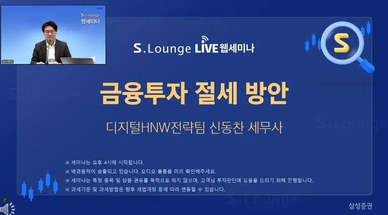 16일 실시한 웹세미나에는 약 2500여명의 디지털 우수고객이 신청해 높은 관심을 보였다. 이번 웹세미나는 ‘금융투자 절세 방안’을 주제로 삼성증권 디지털HNW전략팀 신동찬 세무사가 진행했다.