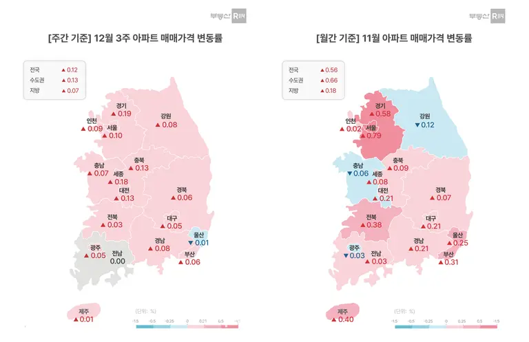 19일 부동산R114에 따르면 12월 셋째 주 전국 아파트 매매가격은 전주 대비 0.12% 상승했다. 서울이 0.10%, 경기·인천 지역 0.17% 등 수도권이 0.13% 오르며 상승세를 주도했다. 비수도권 역시 5대 광역시가 0.06%, 기타 지방이 0.08% 오르며 전반적인 가격 상승이 이어졌다.