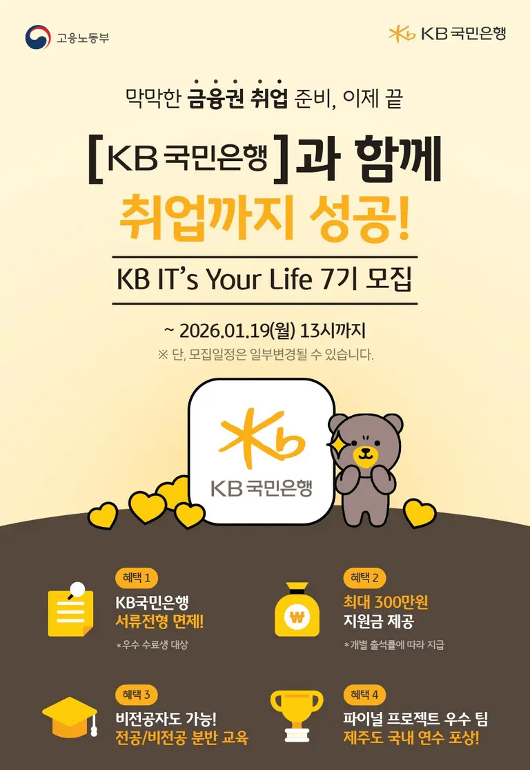 |스마트투데이=강민주 기자| KB국민은행(은행장 이환주)은 다음달 19일까지 청년 IT 인재 양성 프로그램인 ‘KB IT’s Your Life’ 7기 참가자를 모집한다고 22일 밝혔다.