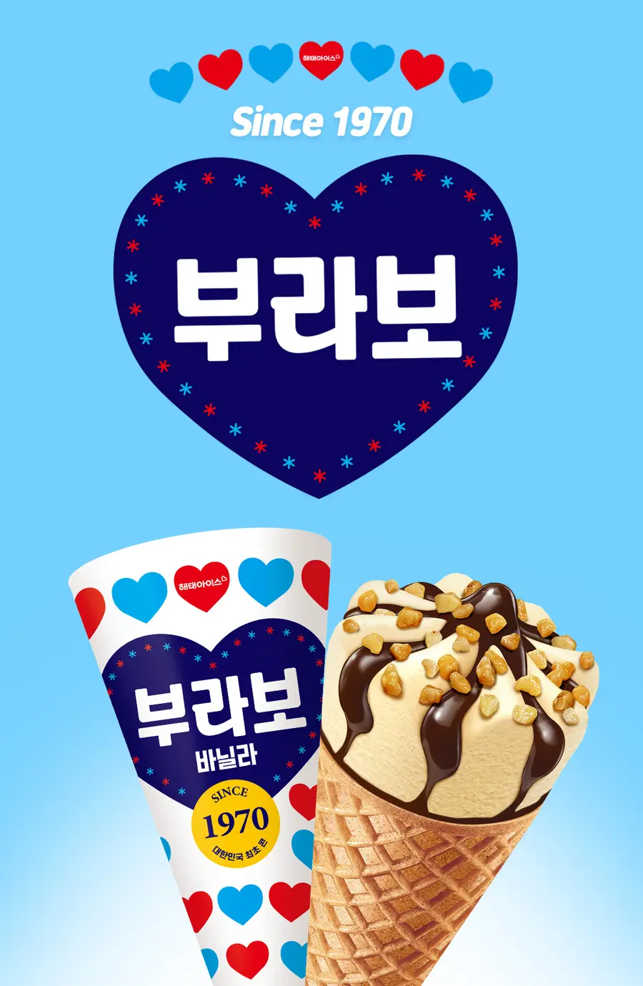 부라보콘은 국내 최초의 콘 아이스크림으로 1970년에 출시해 올해로 55주년을 맞이한 해태아이스의 스테디셀러 제품이다. 2001년에는 국내 최장수 아이스크림으로 기네스북에 등재됐고, 2008년에는 세계 최초로 한 번에 뜯는 포장 방식인 하프 커팅을 적용하는 등 국내 콘 아이스크림 시장을 선도하는 브랜드로 자리 잡았다.