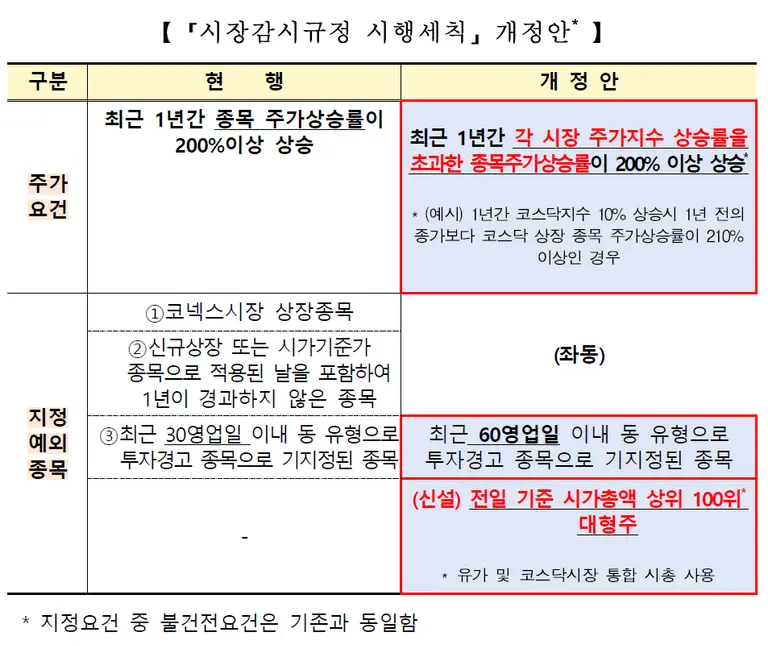 이와 함께 해당 사유로 투자경고종목에 지정해제된 종목은 해제 이후 60영업일 이내에는 지정되지 않도록 규정을 바꾸기로 했다. 기존 30영업일 이내이던 재지정 기간을 두 배로 늘렸다.