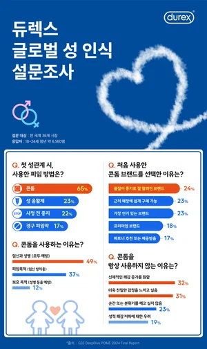 18세에서 24세 사이에 성인남녀 절반 가량이 첫 성관계를 경험했다는 조사보고서가 발표됐다. 이들 중 65% 가량은 피임도구로 콘돔을 사용했다고 밝혔다. 듀렉스는 19일 이같은 내용을 골자로 한 성생활 트렌드 분석 글로벌 성 리포트 를 발간했다.