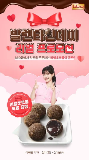 "밸런타이데이, 초코렛만 먹나요. 치킨도 먹고 초코볼도 드세요" 치킨 프랜차이즈그룹 제너시스BBQ 가 밸런타인데이를 맞아 BBQ앱에서 오는 14일까지 인기 사이드메뉴 '리얼초코볼(5ea)'을 증정하는 발렌타인데이 프로모션을 진행한다고 10일 밝혔다.