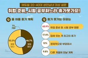 올 여름 휴가 계획이 있는 성인남녀는 절반에 불과한 것으로 나타났다. 또 여름 휴가 계획이 없는 이유로 취업 준비와 시험공부가 꼽혔다. 에듀윌 은 지난 18일부터 7일간 20~40대 성인남녀 197명을 대상으로 여름휴가 계획을 조사한 결과, 휴가를 안가는 이유로 60.