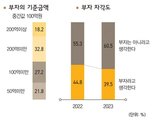 올해 부동산과 증시가 부진하면서, 자신을 부자라고 생각하는 한국 부자가 줄었다. 자산 20억 원 이상의 한국 부자 중 39. 5%만 자신을 부자로 인정했다. 지난해 44. 8%보다 5. 3%포인트 감소했다.