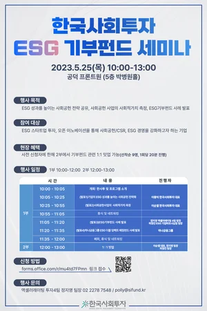 ESG/임팩트투자사 한국사회투자(대표 이종익, 이순열)가 ‘ESG 기부펀드 세미나’를 개최한다고 4일 밝혔다. 한국사회투자는 이번 세미나에서 ESG 성과를 높이는 사회공헌 전략을 공유하고, 사회공헌 사업의 사회적가치를 측정하는 방법에 대한 발표를 진행할 예정이다.