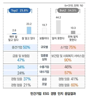중소중견기업의 절반 가량이 ESG에 대해 제대로 인식하지 못하고 있는 것으로 나타났다. 공공 부문과 대기업은 이미 공시 등으로 ESG 경영에 대한 요구를 실감하는 수준에 다다랐으나 덩치가 작은 기업들은 아직은 체감하지 못하고 있다는 의미다.