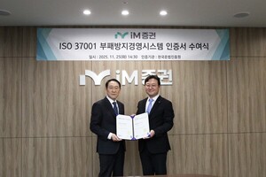 |스마트투데이=김세형 기자| iM증권은 한국준법진흥원으로부터 부패방지경영시스템인 ISO 37001 인증을 획득했다고 26일 밝혔다.인증서 수여식은 25일 서울 여의도 iM증권 본사 13층 대회의실에서 iM증권 김상우 준법감시인과 한국준법진흥원 김명옥 고문 등 관계자들이 참석한 가운데 진행됐다.ISO 37001은 국제표준화기구(ISO)가 제정한 국제표준으로, 조직의 부정부패 예방 및 윤리경영과 관련된 경영시스템 구축 여부를 검증하여 공인받는 인증제도이다. iM증권은 부패방지경영시스템 인증을 통해 부패 리스크에 대한 체계적인 관리와 예