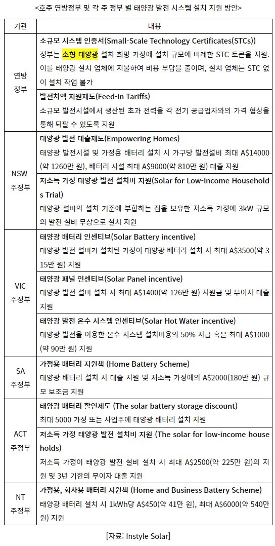 호주 연방∙주 정부의 상업용 및 가정용 태양광 발전시스템 설치에 관련한 활발한 지원책 역시 태양광 시장의 꾸준한 성장 요인이다. 재생에너지로 생산한 전기의 거래가격이 정부가 고시한 가격보다 낮은 경우 연방정부는그 차액을 지원하는 '발전차액 지원제도(Feed-in Tariffs)' 등을 펼치며 적극적으로 가정의 태양광 발전 시설 설치를 독려하고 있다. 주 정부 역시 태양광 패널, 배터리 및 관련설비설치에 대한 인센티브 혹은 대출, 저소득층가정에 공급 확대를 위한 저소득가정 지원책 등을 두고 있다.