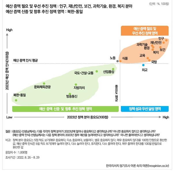 조사를 진행한 한국리서치는 "예산을 증액해야 한다는 응답과 정책 중요도가 상대적으로 낮다고 해서 해당 정책 분야가 중요하지 않다는 의미는 아니다"며 "정책 분야별 중요도를 살펴보았을 때, 북한·통일(26%)을 제외한 나머지 모든 분야에서 중요하지 않다는 응답은 10% 미만에 그쳤다"고 설명했다.